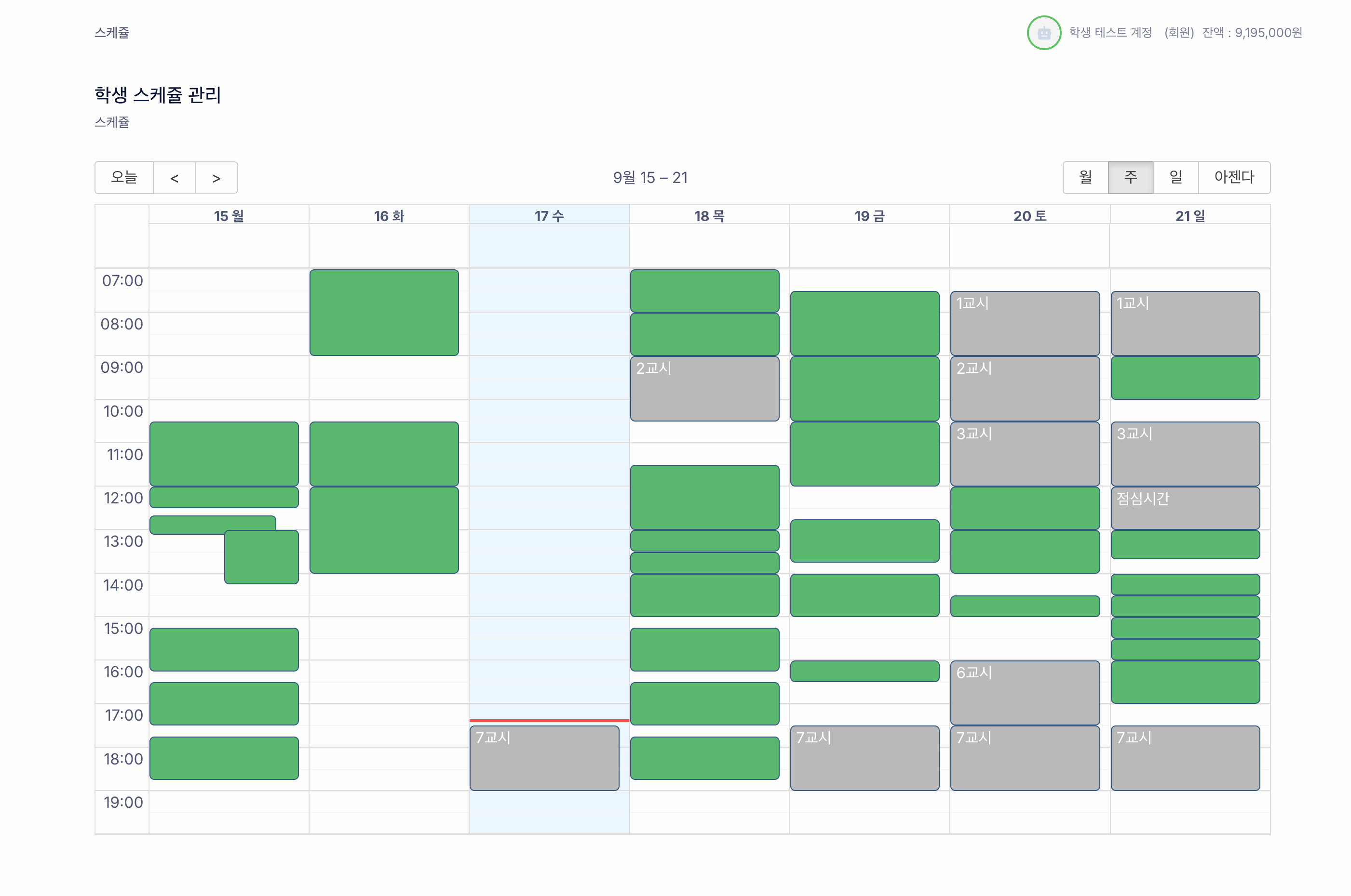 회색으로 O교시 라고 적혀있는 스케쥴이 예약 가능한 스케쥴 입니다.