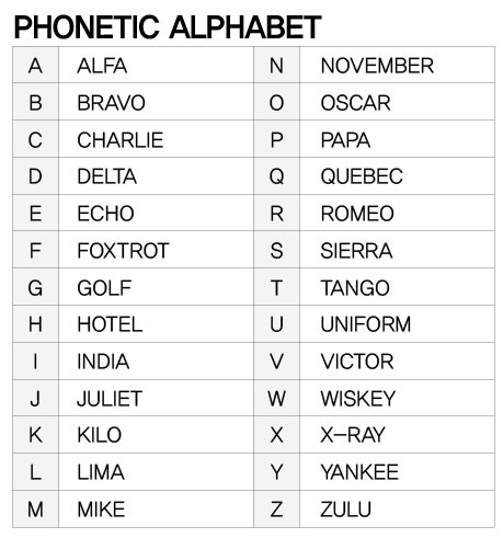 ATC 로 무선통신을 할때 알파벳을 발음해야 하는 경우 포네틱 코드로 말해야 합니다.