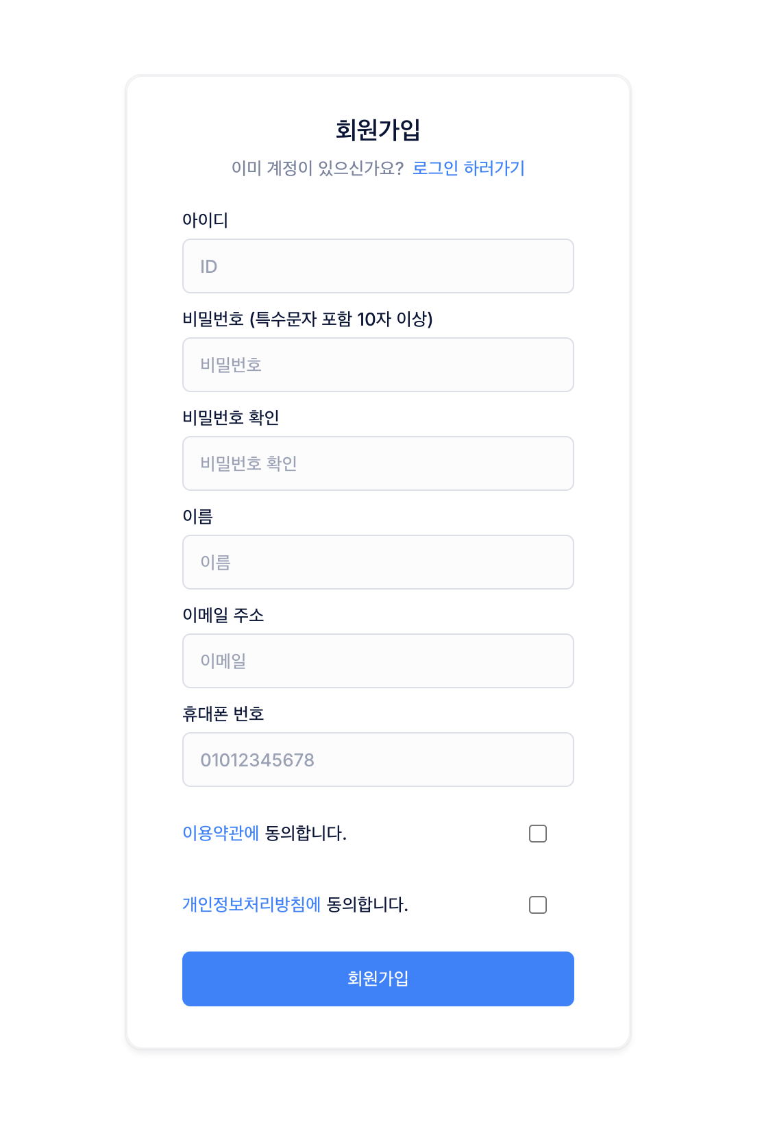 아이디, 비밀번호, 이름, 이메일 주소, 휴대폰 번호 를 모두 정확하게 기입합니다.
