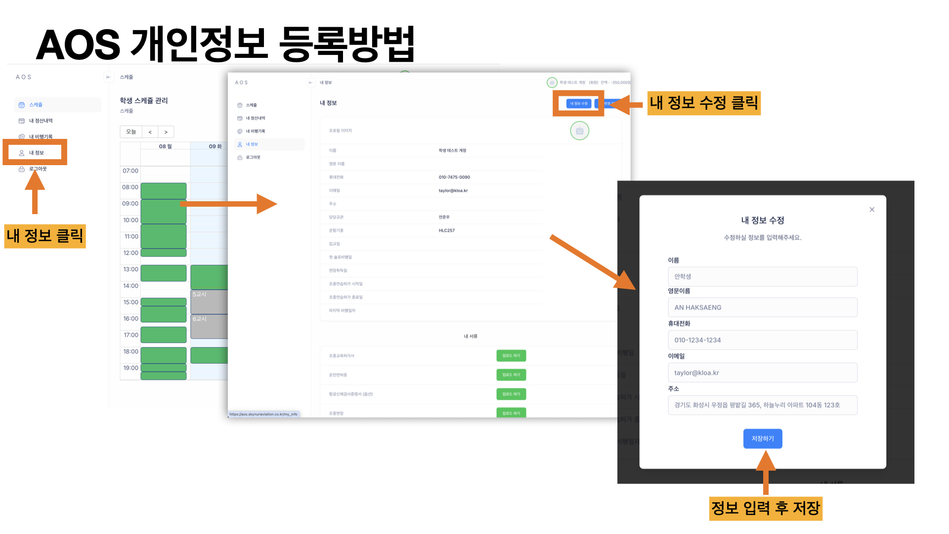 "내 정보" → "내 정보 수정" → 정보입력 후 "저장하기" 클릭