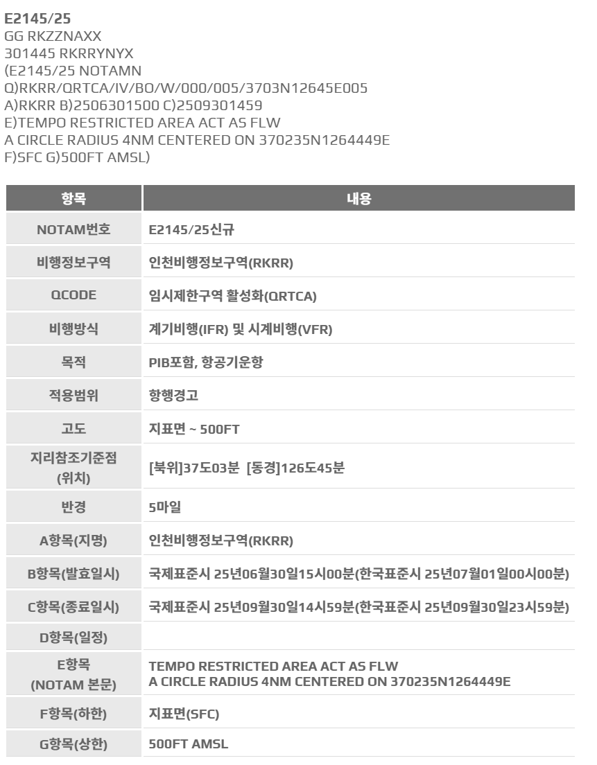 하늘누리 비행장 근처 NOTAM 확인