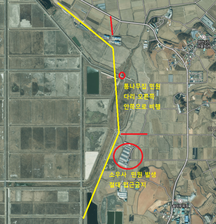 이미지에 표시된 "소 우사" 와 "통나무집" 의 민원으로 인해 Final Approach 구간의 path 가 변경되었습니다.